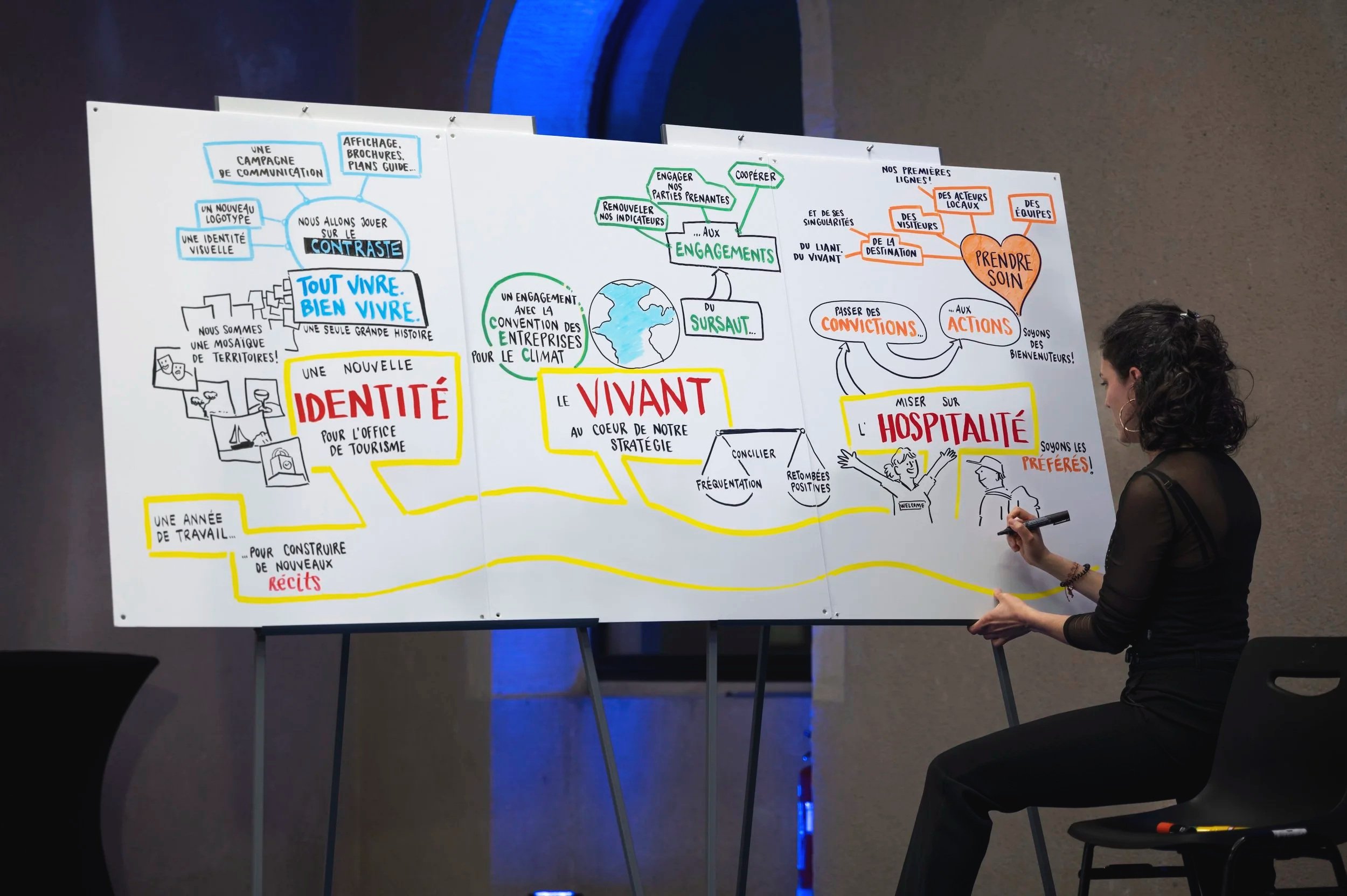 Je synthétise visuellement et en direct le contenu de conférences, réunions, ateliers (scribing live). Je réalise également des résumés visuels de documents, articles, rapports, etc. L’objectif: aider les participant.e.s à suivre les échanges, clarifier des concepts complexes, fédérer des groupes de travail autour d’idées communes.