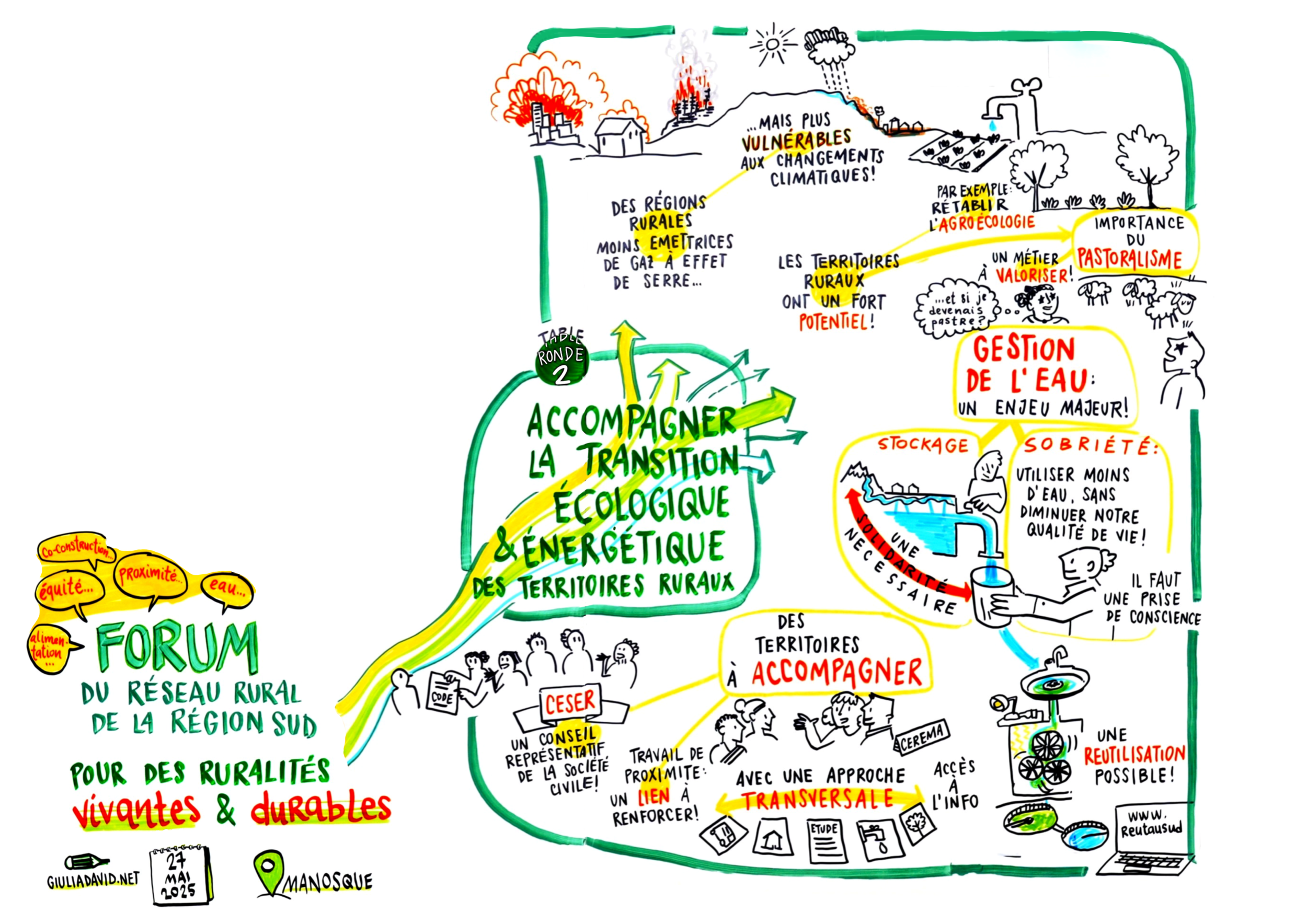 Le 27 mai 2025 se tenait à Manosque le forum du Réseau rural de la Région Sud. A cette occasion, des tables rondes et des ateliers ont permis aux participant.e.s d’échanger sur les enjeux des territoires ruraux dans un objectif de transformation écologique et sociale.
